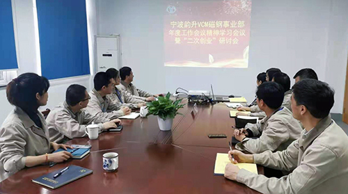 3月31日,VCM磁钢事业部年度工作会议精神学习暨“二次创业”学习研讨会议在三园顺利开展,总经室和各部门中层干部参与学习和讨论。